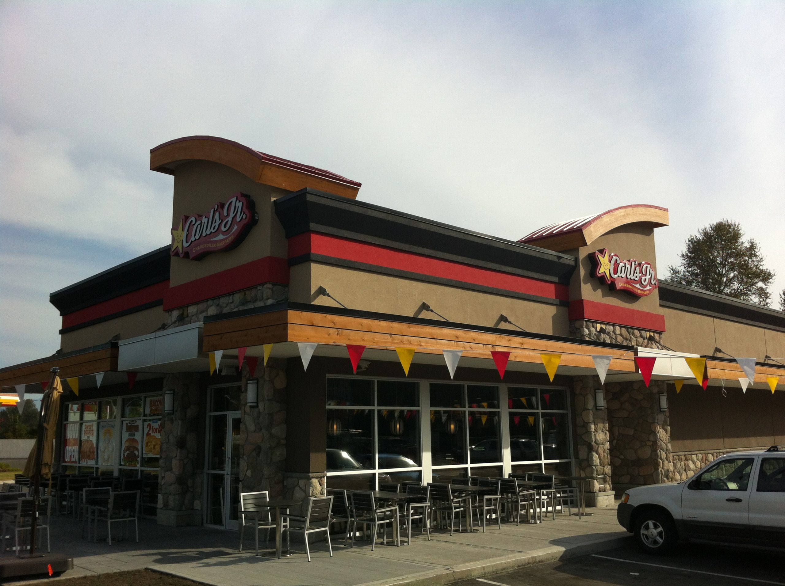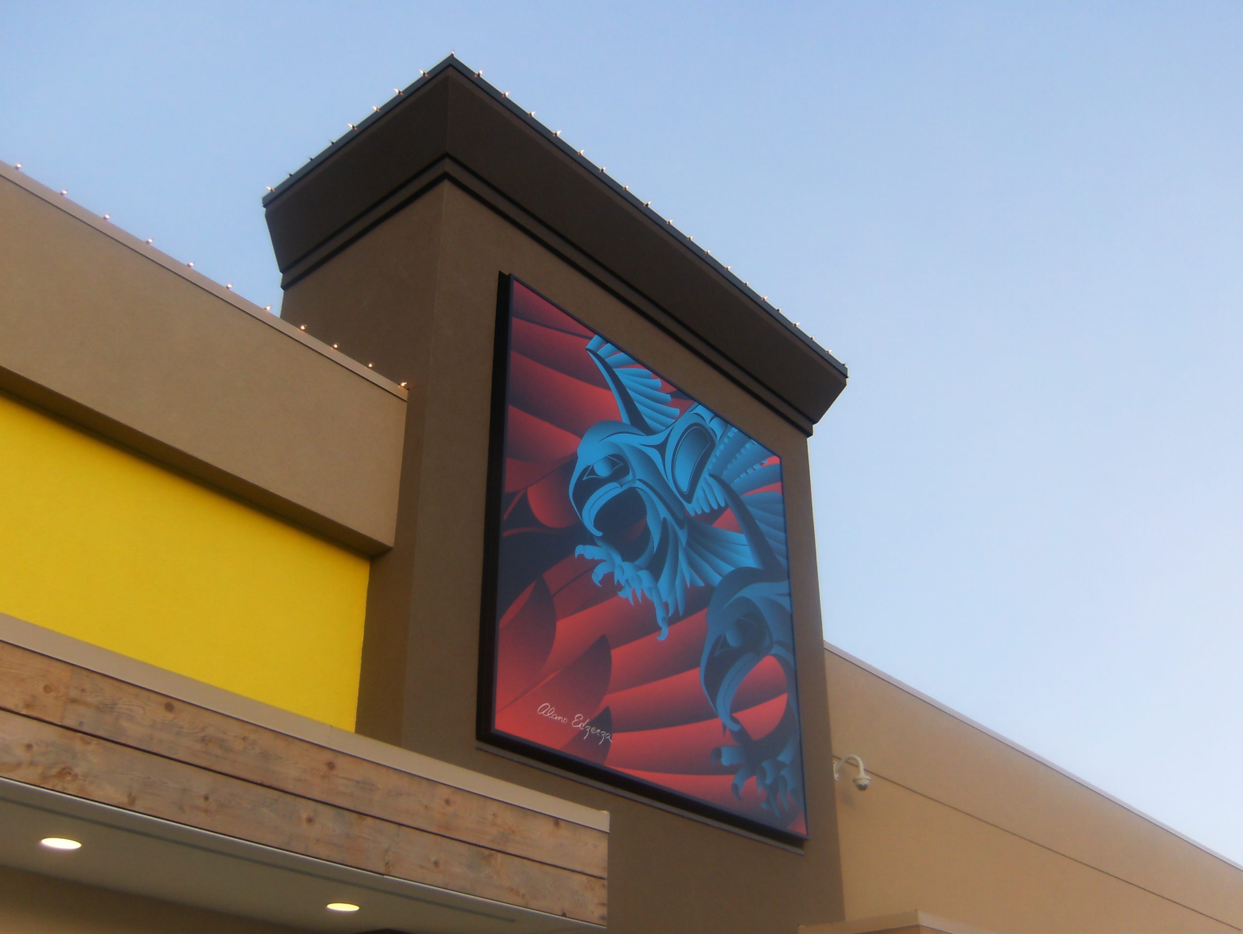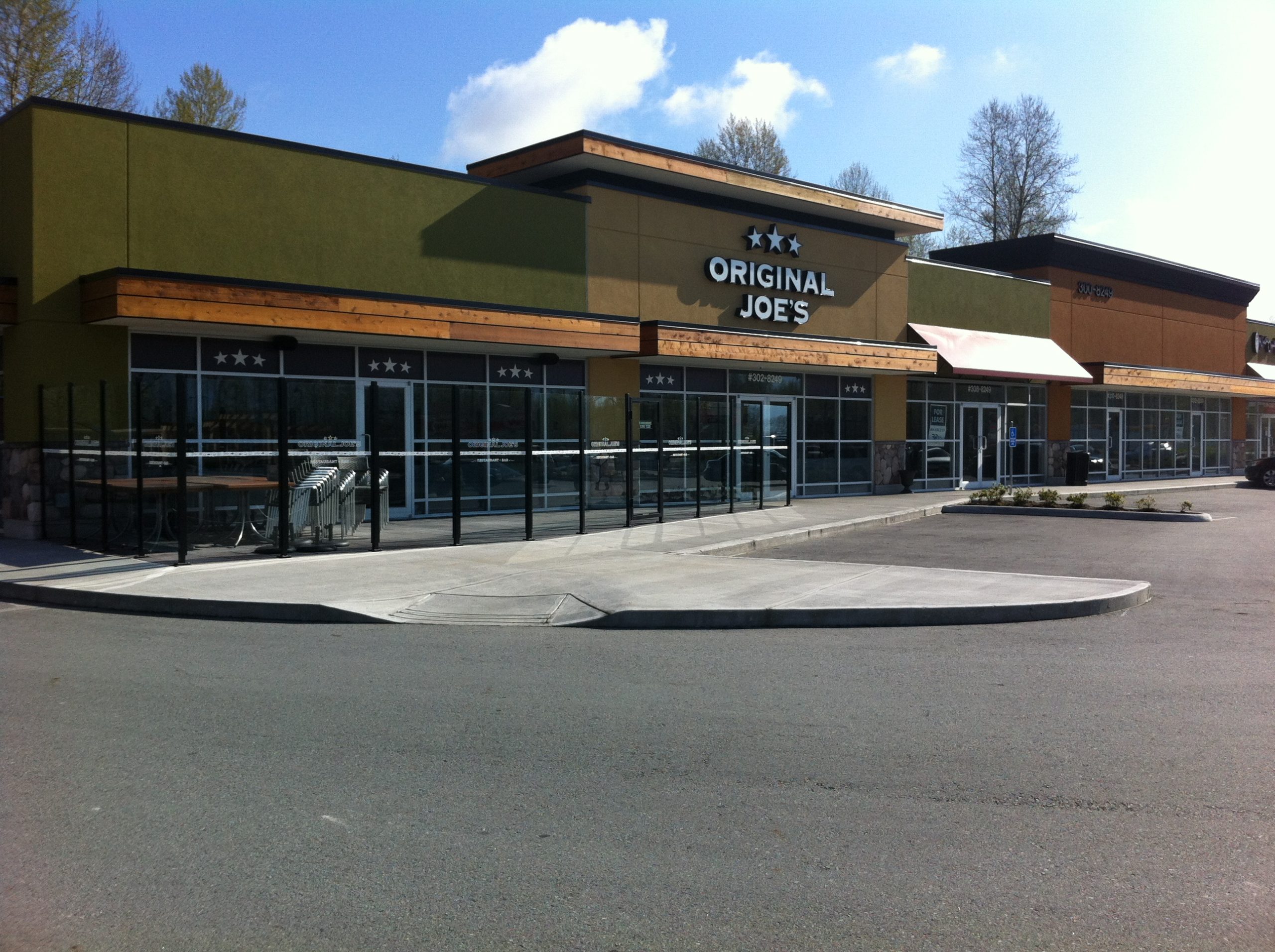 Exterior finishes included EIFS, cultured stone, glulam beams, cedar fascias, fabric awnings, metal composite panels, curtain wall, and aluminum storefront systems. The project also included asphalt paving and landscaping site improvements.