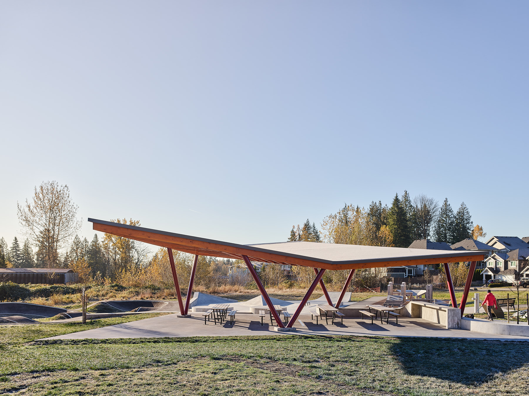 The folded and sloped geometric roof, composed of steel and wood, is supported by four pairs of skewed columns founded on large concrete footings. This intricate and complex structure provides sheltered space for a public picnic area.