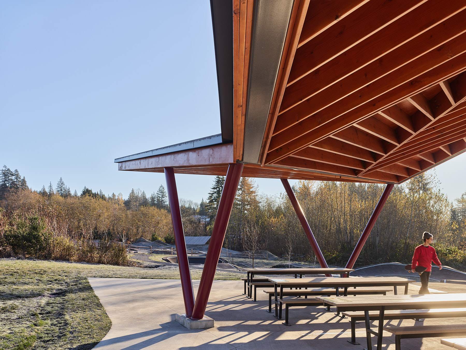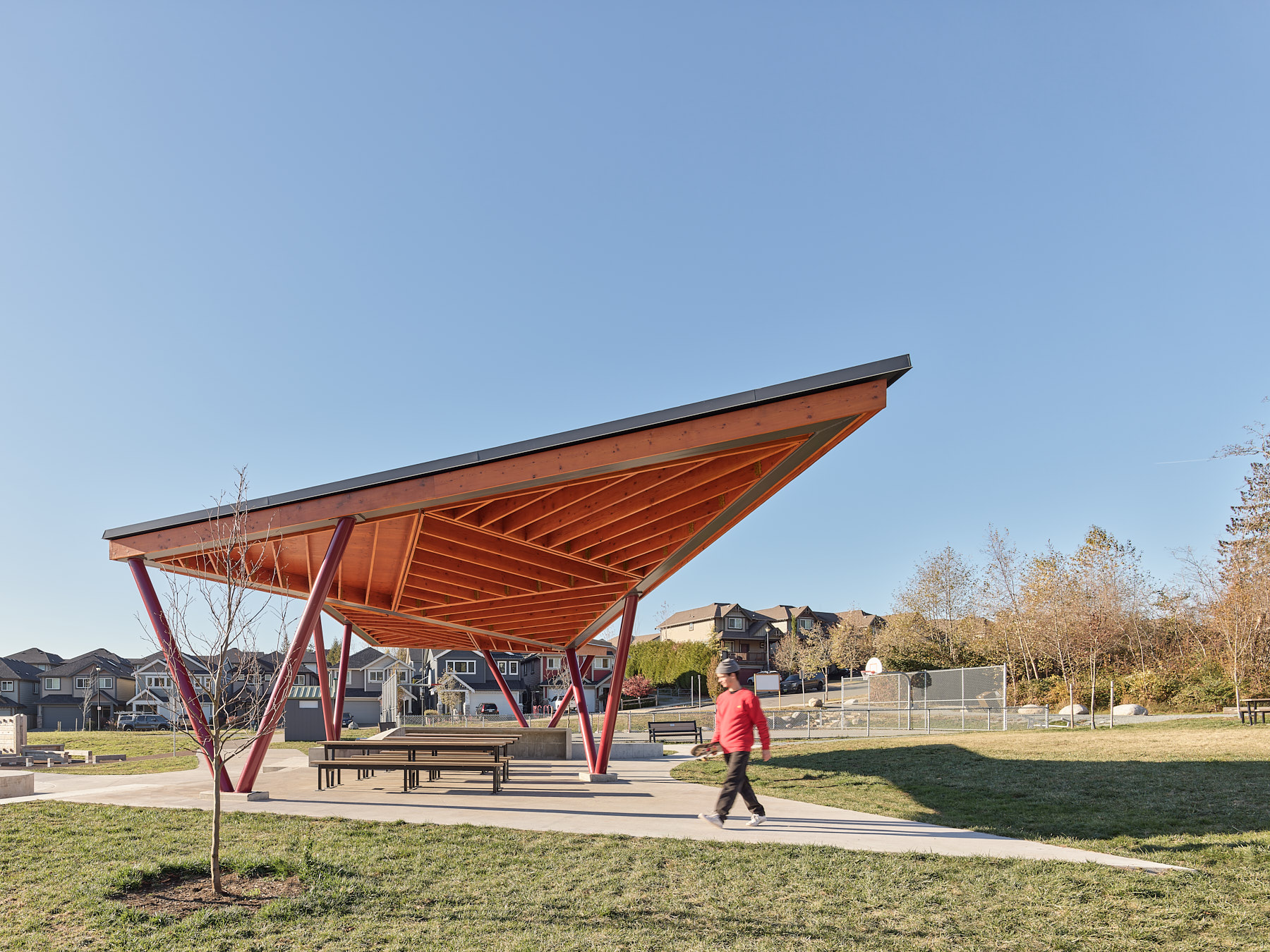 The folded and sloped geometric roof, composed of steel and wood, is supported by four pairs of skewed columns founded on large concrete footings. This intricate and complex structure provides sheltered space for a public picnic area.