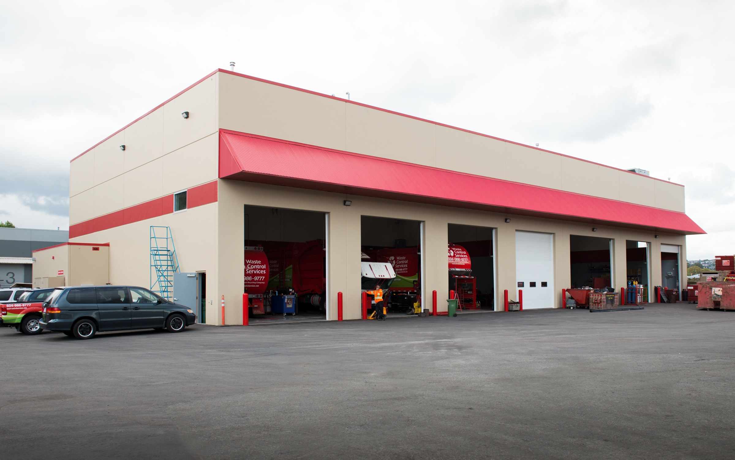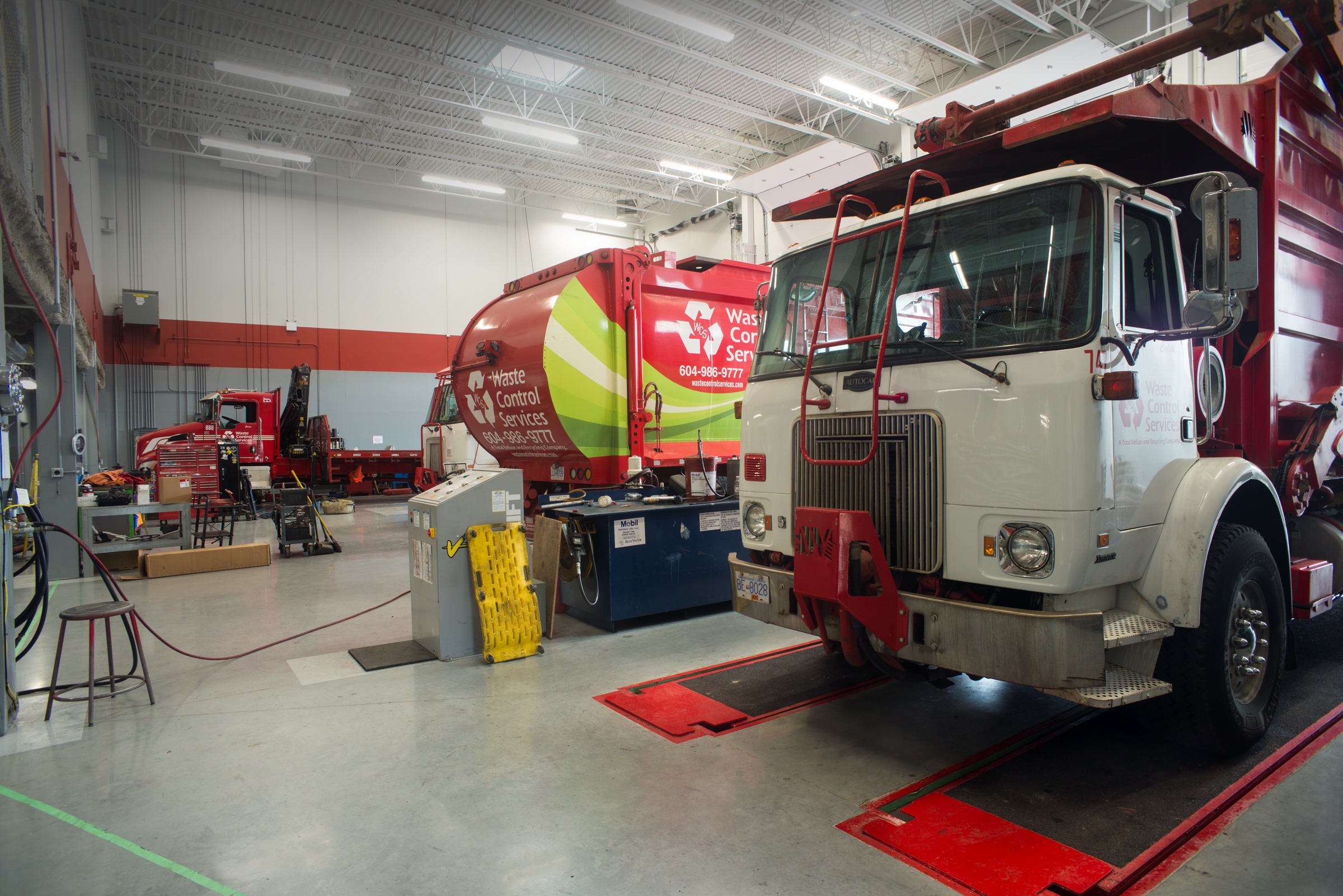 The maintenance building includes dedicated areas for parts, tools, welding, and staff facilities, with operational equipment such as an overhead crane, truck lift, and paint booth. A high-polish concrete floor finish was installed to enhance the work environment.