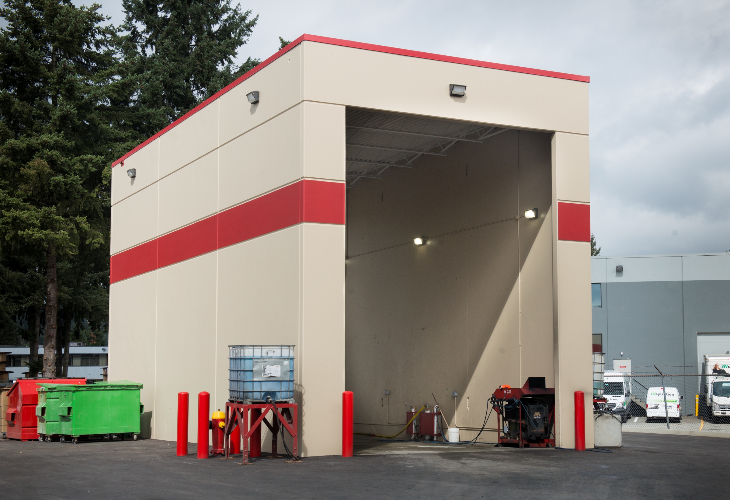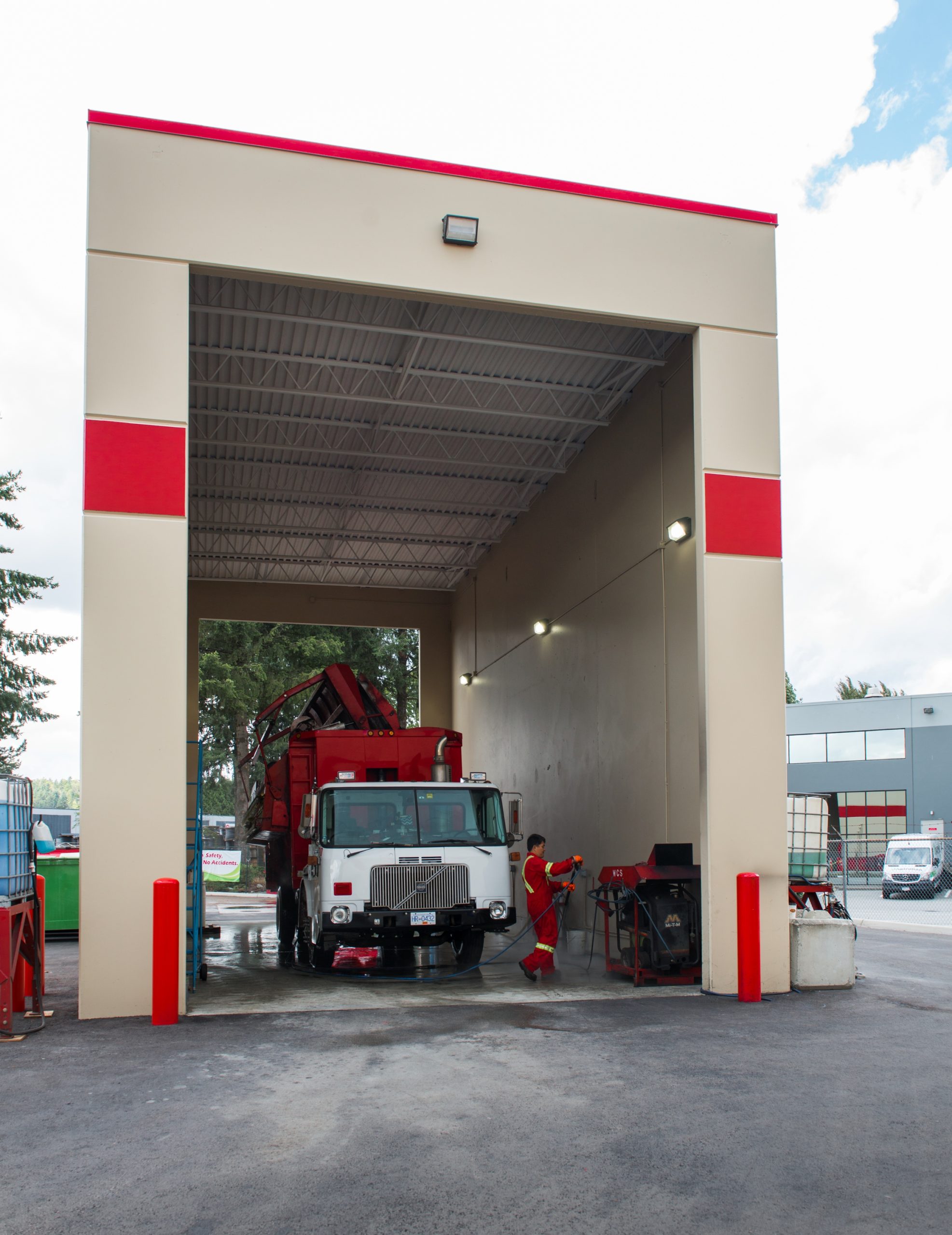 The wash building is an open-air structure equipped with high-pressure washing equipment and a controlled drainage system.